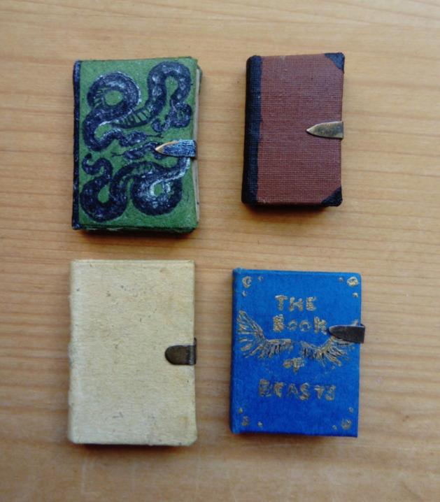 here is a birds eye view of all my books. The newest ones are the blue one and the brown one. The three in the middle are the first ones I made, they are ok, but the spines are a bit unrealistic as I used a single piece of card for each cover instead of dividing them into three sections (as shown in my first post). The shape is not quite right when you compare them to the blue book. The spines also buckles when the books are opened, causing creasing in the wrong places.