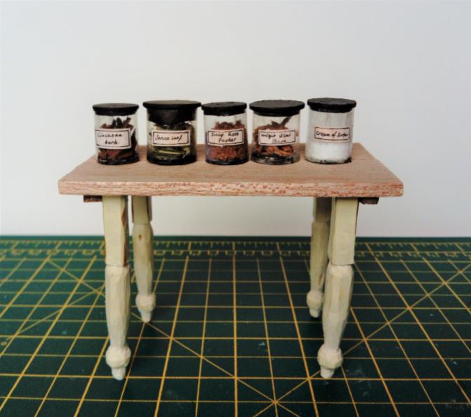 I made a whole shelf’s worth of these jars, but wanting to add a bit of variety, I also used two other types of glass jar, though not made from scratch. As seen below I used some old travel cosmetics jars, replacing the lids with cotton covers and filling them with fresh things like lemons or leeches (both made from air dry clay).