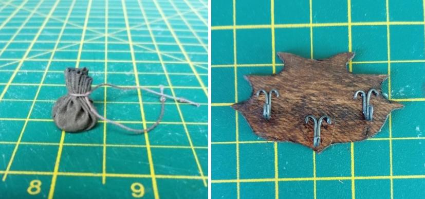 Using hardwood about 0.5 cm thick, I traced and cut my pattern for the cloak rack. I sanded the edges, then darkened it with wood stain, leaving it to dry overnight. For the pegs, I used lengths of wire about 4 cm long, folded them in half, then curved up the folded end to make a hook. I then folded the two unattached ends away from each other in small arcs, as seen below. It’s easier to use two pairs of pliers, as the pegs are so small it’s hard for the fingers to hold them firmly. After making all three pegs, I glued them to the wooden mount with super glue.